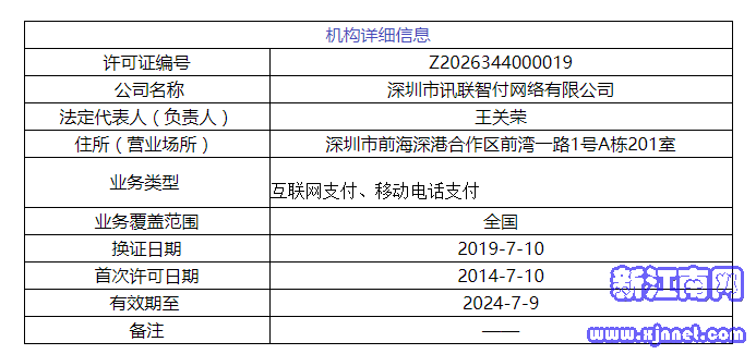 央行官網(wǎng)信息顯示,2014年7月,深圳市訊聯(lián)智付網(wǎng)絡(luò)有限公司獲得支付牌照,業(yè)務(wù)類型為互聯(lián)網(wǎng)支付、移動電話支付、數(shù)字電視支付,覆蓋范圍為全國。最新信息顯示,目前業(yè)務(wù)類型僅為互聯(lián)網(wǎng)支付、移動電話支付,有效期至2024年7月。