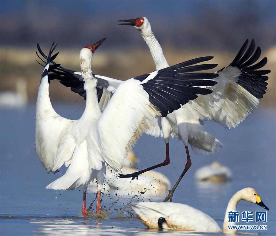 1月11日,兩只白鶴在鄱陽湖畔的五星農(nóng)場嬉戲打鬧。在江西省南昌市鄱陽湖邊的五星農(nóng)場,來此越冬的國家一級保護鳥類白鶴展翅起舞,姿態(tài)萬千。 新華社記者 萬象 攝