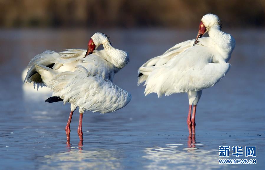 1月11日,兩只白鶴在鄱陽湖畔的五星農(nóng)場梳理羽毛。在江西省南昌市鄱陽湖邊的五星農(nóng)場,來此越冬的國家一級保護鳥類白鶴展翅起舞,姿態(tài)萬千。 新華社記者 萬象 攝