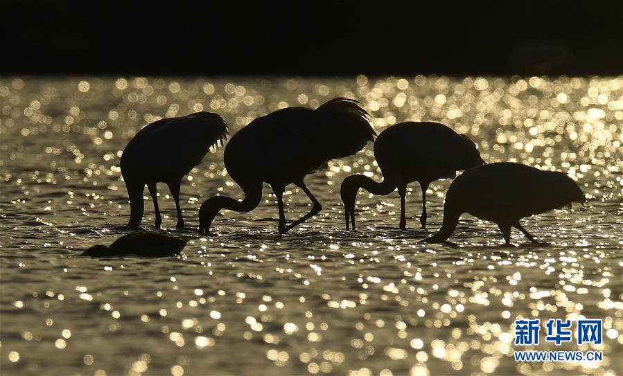 白鶴在位于鄱陽湖畔的五星農(nóng)場濕地覓食(1月10日攝)。在江西省南昌市鄱陽湖邊的五星農(nóng)場,來此越冬的國家一級保護鳥類白鶴展翅起舞,姿態(tài)萬千。 新華社記者 萬象 攝