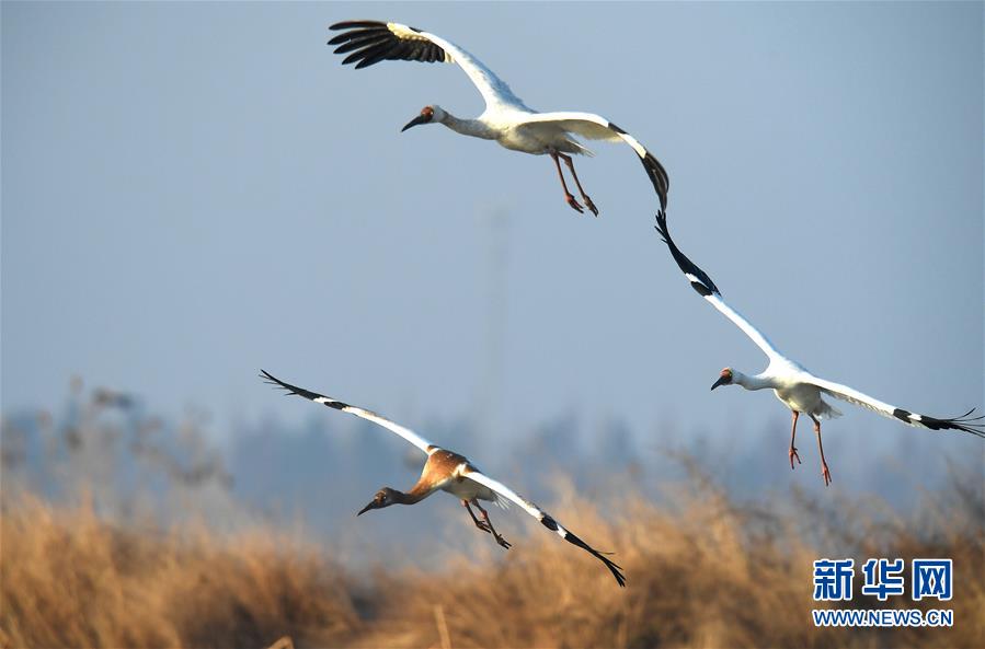 1月11日,白鶴在位于鄱陽湖畔的五星農(nóng)場上空飛翔。在江西省南昌市鄱陽湖邊的五星農(nóng)場,來此越冬的國家一級保護鳥類白鶴展翅起舞,姿態(tài)萬千。 新華社記者 萬象 攝