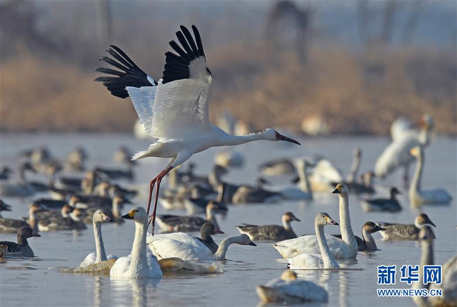 1月11日,一只白鶴在位于鄱陽湖畔的五星農(nóng)場的濕地中飛翔。在江西省南昌市鄱陽湖邊的五星農(nóng)場,來此越冬的國家一級保護鳥類白鶴展翅起舞,姿態(tài)萬千。 新華社記者 萬象 攝