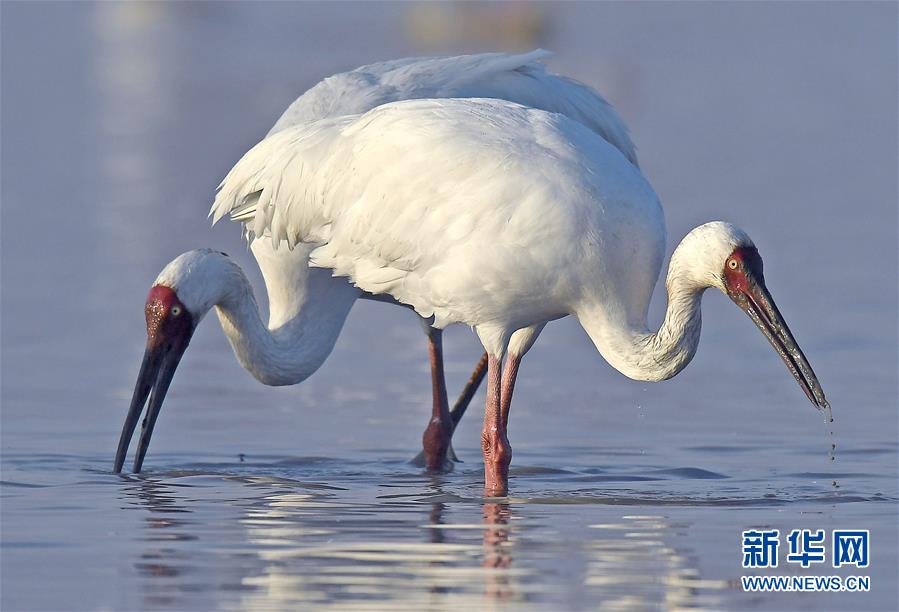 1月11日,在位于鄱陽湖畔的五星農(nóng)場,兩只白鶴在濕地中覓食。在江西省南昌市鄱陽湖邊的五星農(nóng)場,來此越冬的國家一級保護鳥類白鶴展翅起舞,姿態(tài)萬千。 新華社記者 萬象 攝