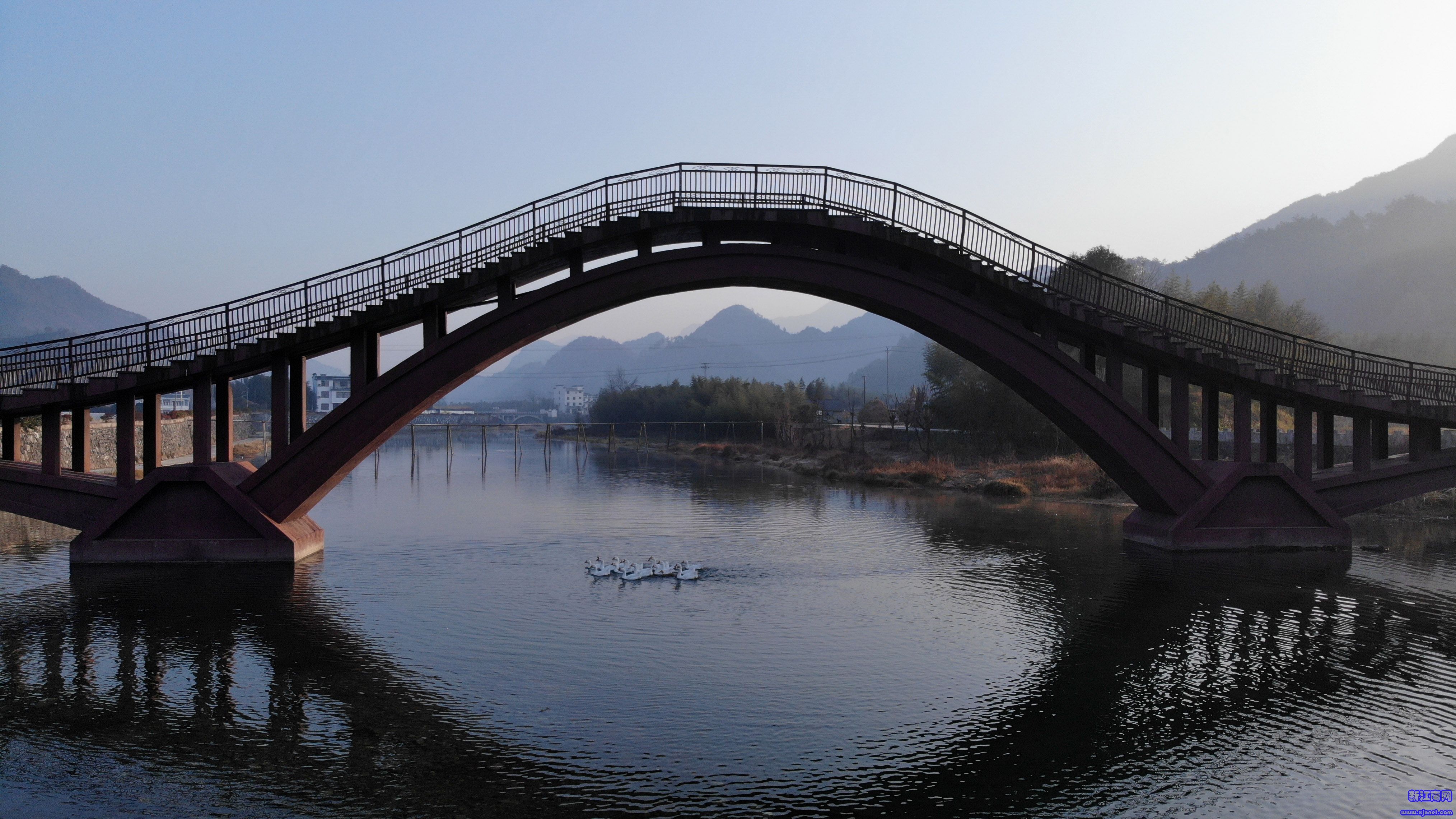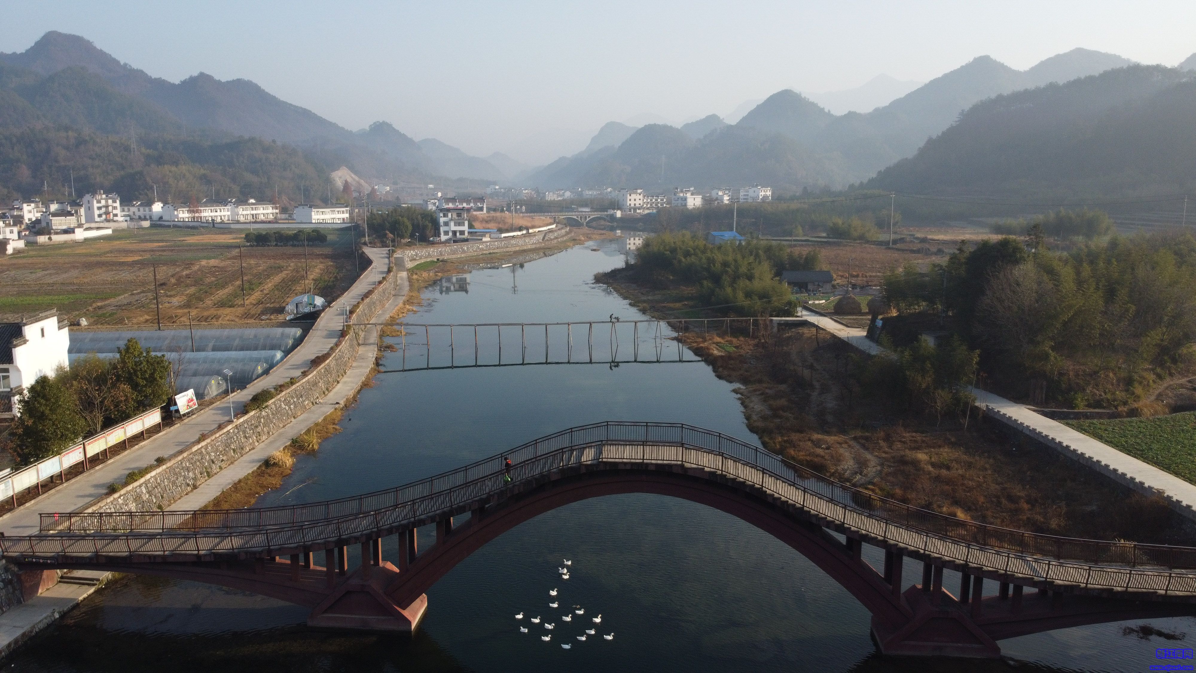 ↑12月13日早晨,一群鵝從龍川村的一座橋下游過 (無人機(jī)拍攝)。新華社發(fā)(黃博涵攝)