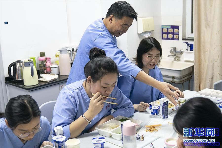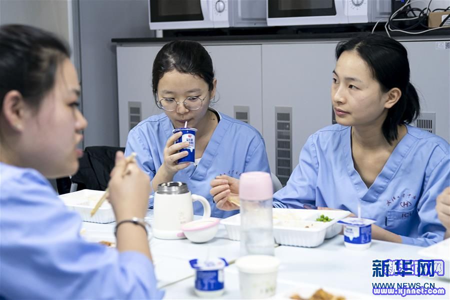1月24日,武漢大學(xué)中南醫(yī)院重癥醫(yī)學(xué)科的醫(yī)護(hù)人員在辦公室吃年夜飯。新華社記者 熊琦 攝