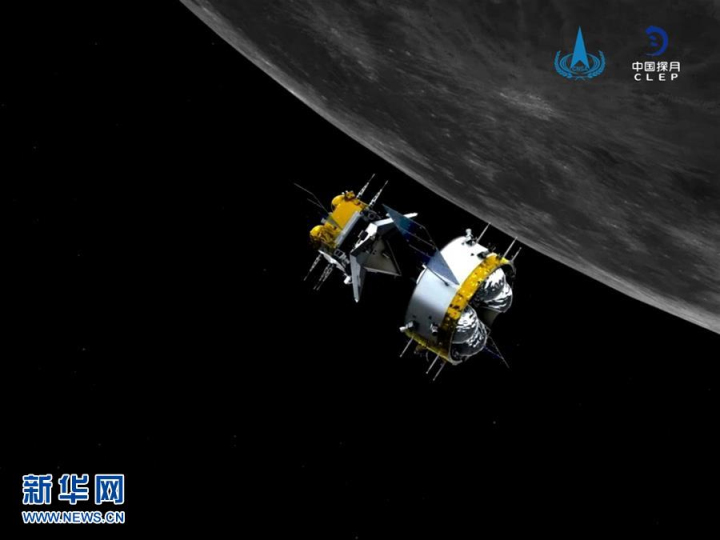 軌返組合體與上升器分離后模擬圖。記者從國家航天局獲悉,北京時間12月6日12時35分,嫦娥五號軌道器返回器組合體與上升器成功分離,進入環(huán)月等待階段,準備擇機返回地球。新華社發(fā)(國家航天局供圖)