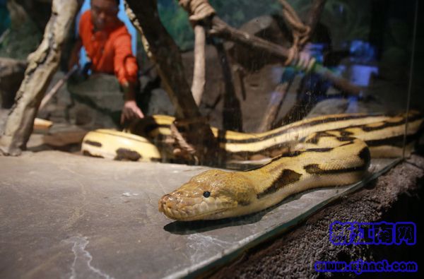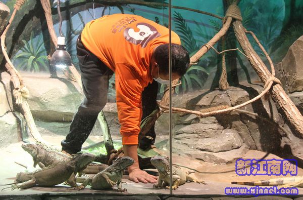 來(lái)自熱帶、亞熱帶的兩爬動(dòng)物,在無(wú)錫冬日的冰點(diǎn)溫度下依然享受著溫暖,這得依靠館內(nèi)地暖、豐容樹(shù)枝的加熱絲以及中央空調(diào)。新建兩爬館的飼養(yǎng)員董師傅每周會(huì)為一些蛇類(lèi)、陸龜?shù)确峙M(jìn)行泡澡。據(jù)董師傅介紹:“一般會(huì)選擇比較溫順的蟒蛇幫助其洗澡,像體長(zhǎng)一米的紅尾蟒就比較溫順,每周會(huì)為其在特定浴室內(nèi)用溫水泡澡,一是為了促進(jìn)其排便,二是為了促進(jìn)其蛻皮。”當(dāng)然,在每種動(dòng)物的展示區(qū)域內(nèi),也會(huì)設(shè)有水域。像館內(nèi)身長(zhǎng)近7米的網(wǎng)紋蟒會(huì)自行泡澡,室內(nèi)環(huán)境溫度控制在27—31℃,熱點(diǎn)溫度控制在31—33℃。