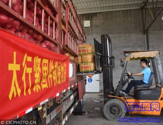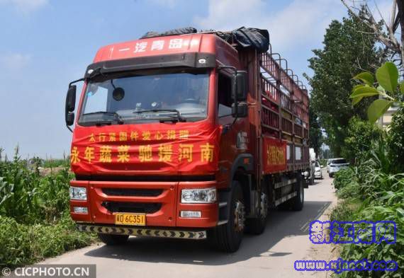 ↑載有蔬菜和純凈水的車輛從河北省邯鄲市永年區(qū)出發(fā)運(yùn)往河南省。CICPHOTO/胡高雷 攝