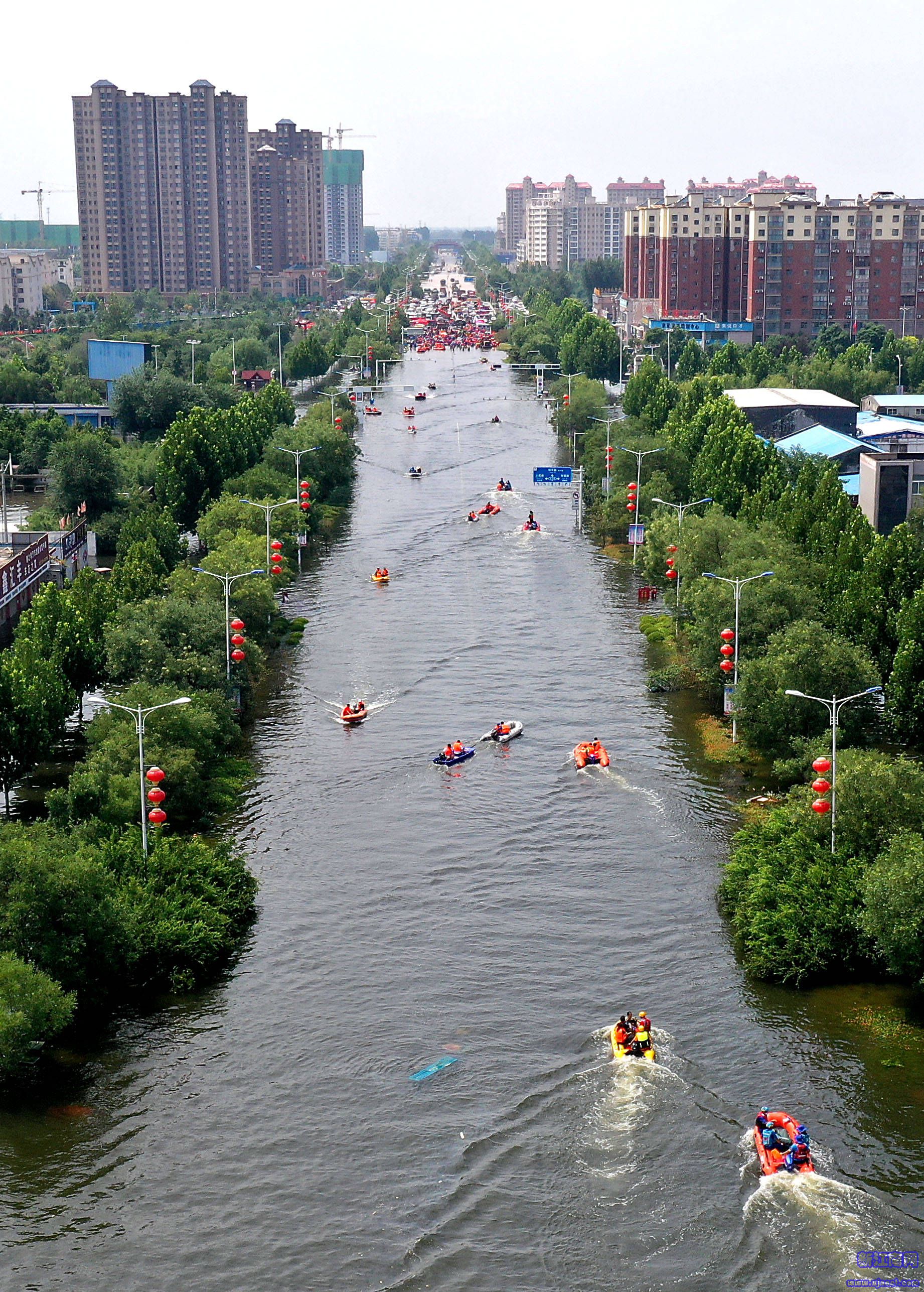 7月27日,救援人員駕駛橡皮艇、沖鋒舟等在衛(wèi)輝城區(qū)搜救被困群眾(無(wú)人機(jī)照片)。