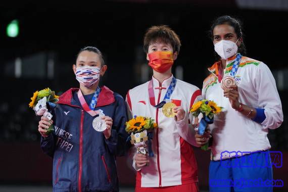8月1日,獲得金牌的中國選手陳雨菲(中)、獲得銀牌的中國臺北選手戴資穎(左)和獲得銅牌的印度選手辛度在頒獎儀式上。新華社記者 薛玉斌 攝