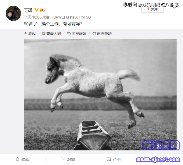 今天上午10點(diǎn),德云社相聲演員、郭德綱搭檔于謙在個(gè)人微博發(fā)了一張“小馬駒跳槽”的照片,并寫道:“50多了,換個(gè)工作,有可能嗎?”