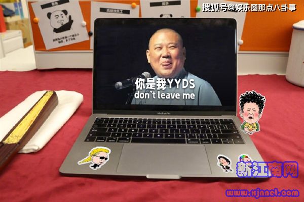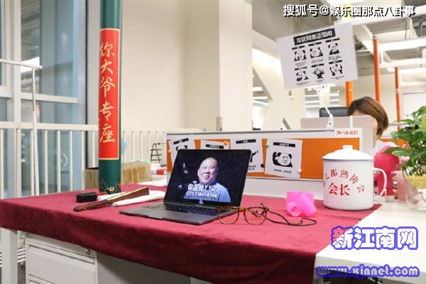 照片中,工位上可以看到醒木、折扇和手帕,還有一個(gè)翠綠大柱子上貼有“你大爺專座”條幅。中間的筆記本上,貼滿了于謙的大頭貼,屏幕背景是郭德綱表情包大喊“你是我YYDS(永遠(yuǎn)的神)”。