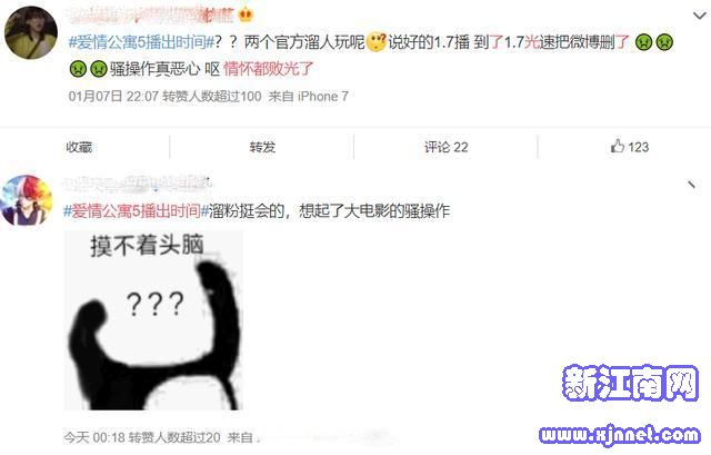 到了1月7日晚上,大家都做好準(zhǔn)備要開(kāi)始看了,結(jié)果從8點(diǎn)等到10點(diǎn)還沒(méi)有,然后等到11點(diǎn),還是沒(méi)有上線。幾萬(wàn)觀眾等了一個(gè)晚上都沒(méi)看到《愛(ài)情公寓5》播出,這才發(fā)現(xiàn)被騙了!明明發(fā)出來(lái)的定檔海報(bào)、宣傳片上寫著1月7日,結(jié)果什么都沒(méi)看到,這不是“溜粉”是什么?